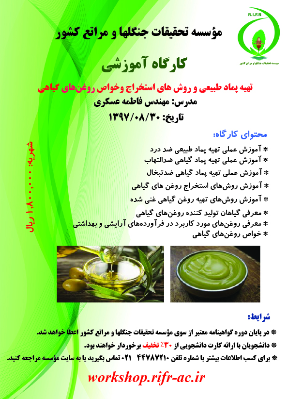 تهیه پماد طبیعی و روش های استخراج و خواص روغن های گیاهی (تاریخ برگزاری: ۹۷/۰۸/۳۰)